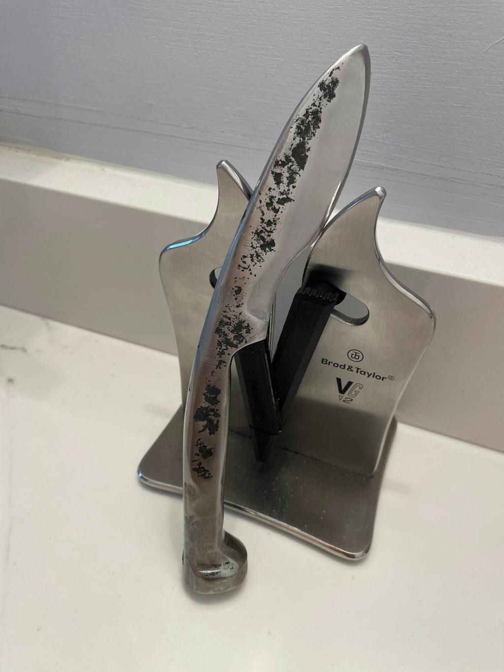 There are many different grades of tungsten carbide, they are not all created equal. It is definitely a case of getting what you pay for. Bargain-bin, so-called tungsten carbide sharpeners are little more than poor quality sheet metal. Brød & Taylor’s Austrian-made tungsten carbide is extremely hard (Rockwell hardness HRC 95 — much harder than knives, which fall into the HRC 60-70 range) and is precision-ground with a very sharp cutting edge and polished, flat surfaces for honing and polishing. Visually compare the sharpeners to any other product and the difference is obvious.
